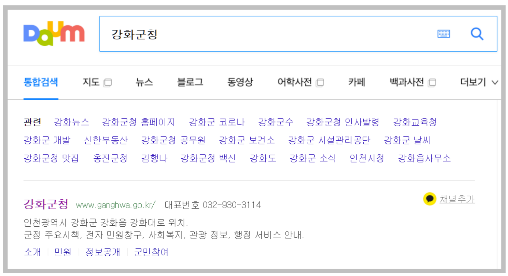 위 화면처럼 다음에 가셔서 간단하게 '강화군청'이라고 검색만 해도 쉽게 원하느 검색 결과를 보실 수 있습니다. 꼭 다음에서만 되는것도 아니고 네이버나 네이트, 구글과 같은 사이트를 통해서 들어가시면 되리라 생각이 드네요.