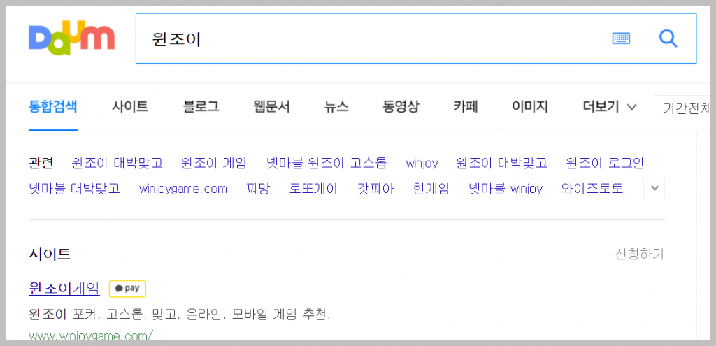 위와 같은 화면은 다음에서 검색한 결과입니다. 게임 윈조이라고 표시된 항목을 클릭하면 손쉽게 홈페이지로 들어갈 수 있습니다.