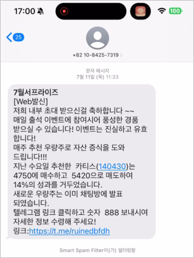 아이폰의 경우에는 지금까지 이러한 것들이 제대로 필터링이 안되었습니다. 진짜 오면 오는대로 다 받았죠. 정말 짜증납니다. 근데 최근에 스마트 스팸 필터라는 거 설치한 다음부터 완전히 느끼지 못하고 있습니다 자동으로 스팸으로 처리가 되지요.