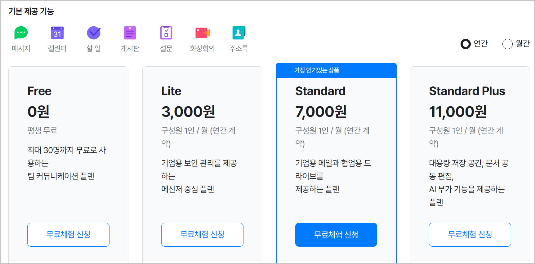 기본적으로는 무료로 제공되는 기본 요금제가 있으며, 이를 통해 이메일, 캘린더, 메신저, 드라이브 같은 기본적인 기능을 사용할 수 있습니다.