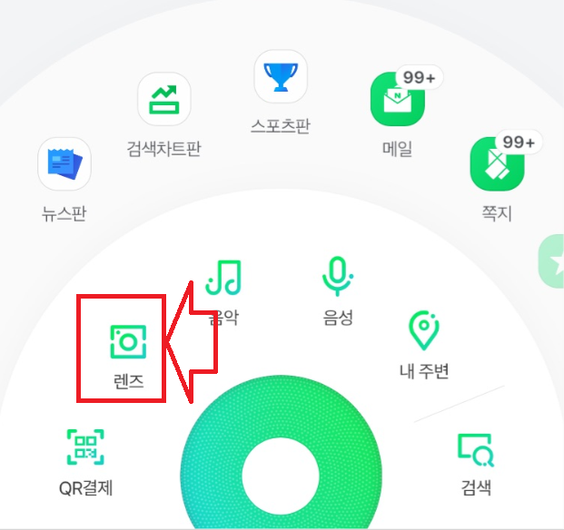 그리고 검색창 오른쪽에 있는 원을 꾸욱 누르고 있으면 위와 같은 화면 메뉴를 볼 수 있습니다. 이곳에서 사진에 표시한것과 같이 렌즈를 선택하면 네이버 스마트렌즈로 들어가면서 카메라가 커지게 됩니다. 가운데 네모에 바코드를 위치하게 되면 앱이 반응을 하게 됩니다.
