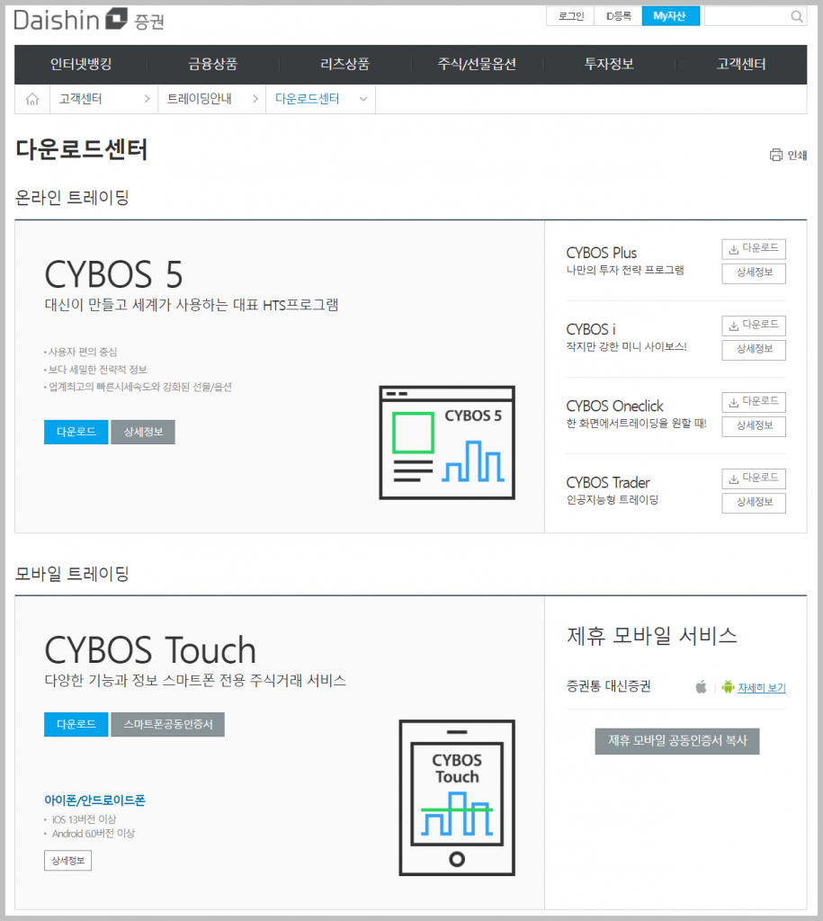 대신증권 hts 다운로드 위해서는 먼저 홈페이지에 들어가야 합니다. 대부분의 프로그램이나 어플은 홈페이지에 가면 바로 다운로드할 수 있는데 CYBOS는 홈페이지에서 쉽게 찾을 수 없습니다. 그래서 바로 들어갈 수 있도록 링크를 가져왔습니다.