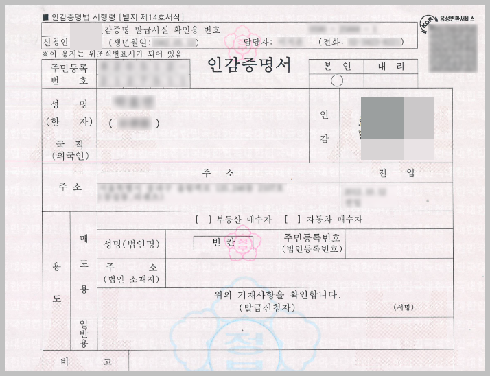 인감증명서는 행정청에 신고된 인감과 동일함을 증명하는 문서로, 개인용과 법인용 두 종류가 있습니다. 보통 개인용 말할 때가 많으며, 이는 법원에서 주로 사용되는 중요한 문서입니다. 그래서 이 문서가 필요한 경우가 종종 생깁니다.