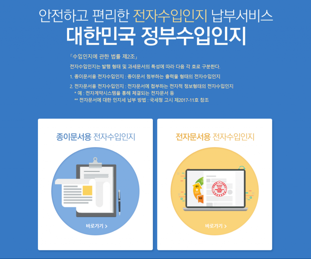이곳에서 종이용과 전자용을 선택할 수 있습니다. 과거의 종이 수입인지는 매우 번거롭게 사용했던 기억이 납니다. 은행이나 우체국을 꼭 방문해야 했기에 여간 귀찮은 일이 아니었습니다. 오래 전에는 10만원 짜리도 없었던 것 같은데요. 이렇게 전자형태로의 전환 덕에 불편함이 크게 해소되어 다행스럽습니다.