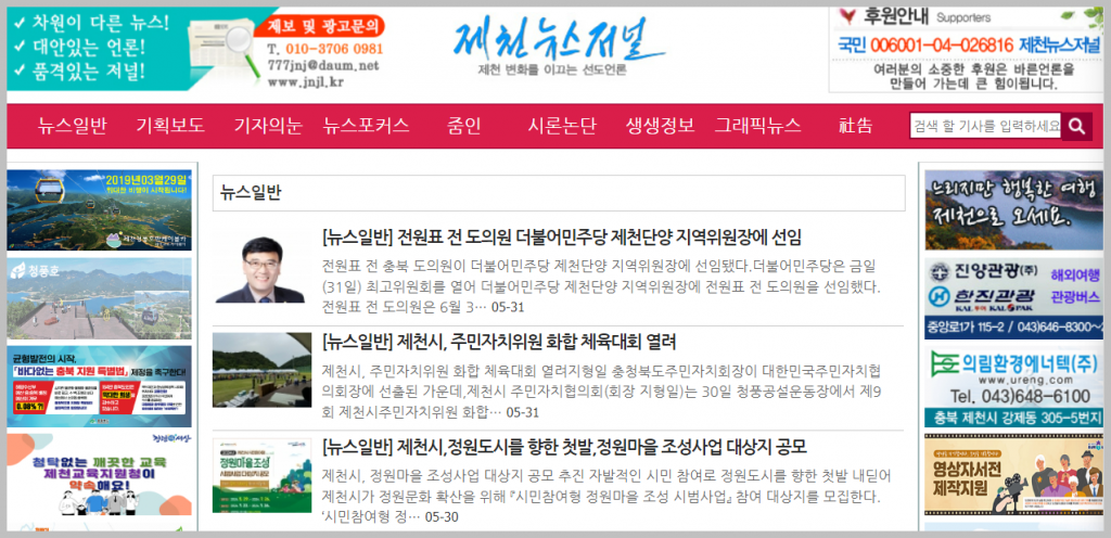두번째, 제천뉴스저널이라는 홈페이지도 존재합니다. 앞서 소개한 곳보다 광고가 많아서 복잡해보이긴 하지만 이곳도 지역 소식을 다루는 곳이기에 함께 소개하도록 하겠습니다.