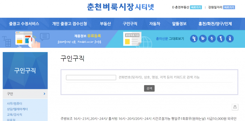 이곳에 접속하기 위해서는 네이버에서 '춘천벼룩시장 시티넷'을 검색해야 합니다. 또는 위 링크를 통해서 곧바로 접속할 수 있습니다. 해당 사이트는 부동산, 구인구직, 자동차 등 다양한 소식를 제공하고 있습니다. 많은 분들이 구인구직을 목적으로 들어오시기 때문에, 이를 클릭하면 아래와 같은 화면을 볼 수 있습니다.