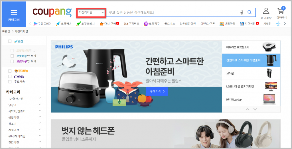 로켓설치가 아닌 일반 가전 제품을 찾고 싶다면, 일반 가전 카테고리 페이지를 방문해야 합니다. 쇼핑몰에서 카테고리만 바꿔도 충분합니다. 앞선 로켓설치 페이지에서는 제한된 제품만 볼 수 있기 때문에 이곳에서는 좀 더 많은 물건들을 볼 수 있다는 장점이 있죠.