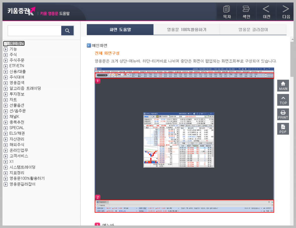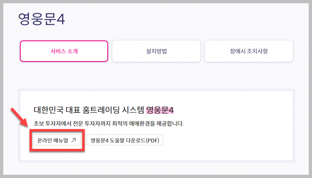 이러한 사용자들을 위해 키움증권은 온라인 메뉴얼을 제공하고 있습니다. 모든 서비스 및 프로그램을 사용하기 전에 메뉴얼을 먼저 읽어보는 것이 좋습니다, 특히 돈을 다루는 것은 더욱 그렇습니다. 홈페이지에 들어가면 영웅문4에 대한 간략한 설명을 찾을 수 있으며, 키움증권 HTS의 사용법 페이지는 아래와 같이 보일 것입니다.