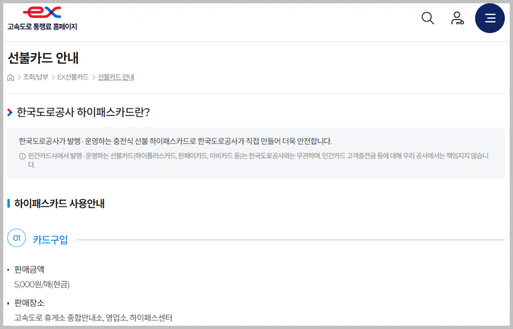 먼저, 가장 큰 차이점은 발급 방법입니다. 후불 하이패스 카드는 은행에서 다른 체크-신용카드를 발급받듯이 발급받을 수 있습니다. 반면, 선불 카드는 아래 사진에 나온 것처럼 고속도로 홈페이지를 통해 구매할 수 있습니다.