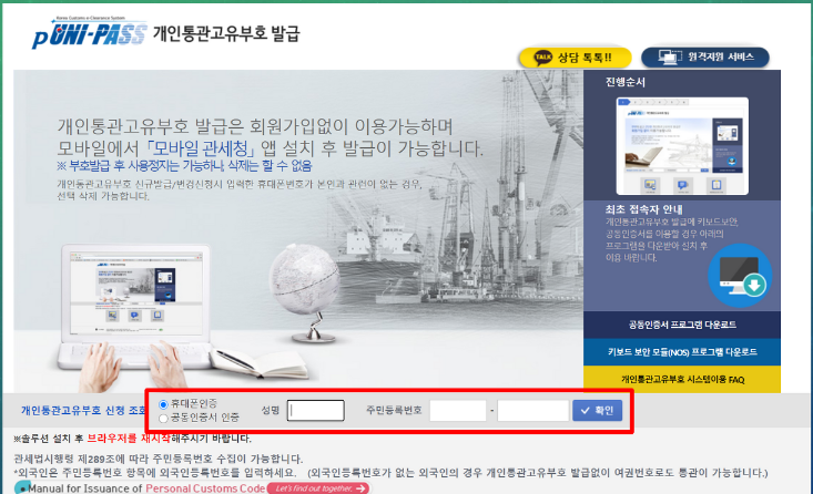 만약 코드가 유출되거나 남용될 가능성이 있다면 재발급을 받을 수 있습니다. 연간 최대 5회까지 재발급이 가능하다고 합니다. 이번 포스팅에서는 신청하는 방법에 대해 다뤄보도록 하겠습니다. 먼저, 관세와 관련된 사항이므로 관세청 홈페이지에서 발급을 신청할 수 있습니다. 휴대전화나 공인인증서와 같은 본인 확인이 필요하니 참고하시길 바랍니다. 아래의 링크를 통해 홈페이지로 바로 이동하실 수 있습니다.