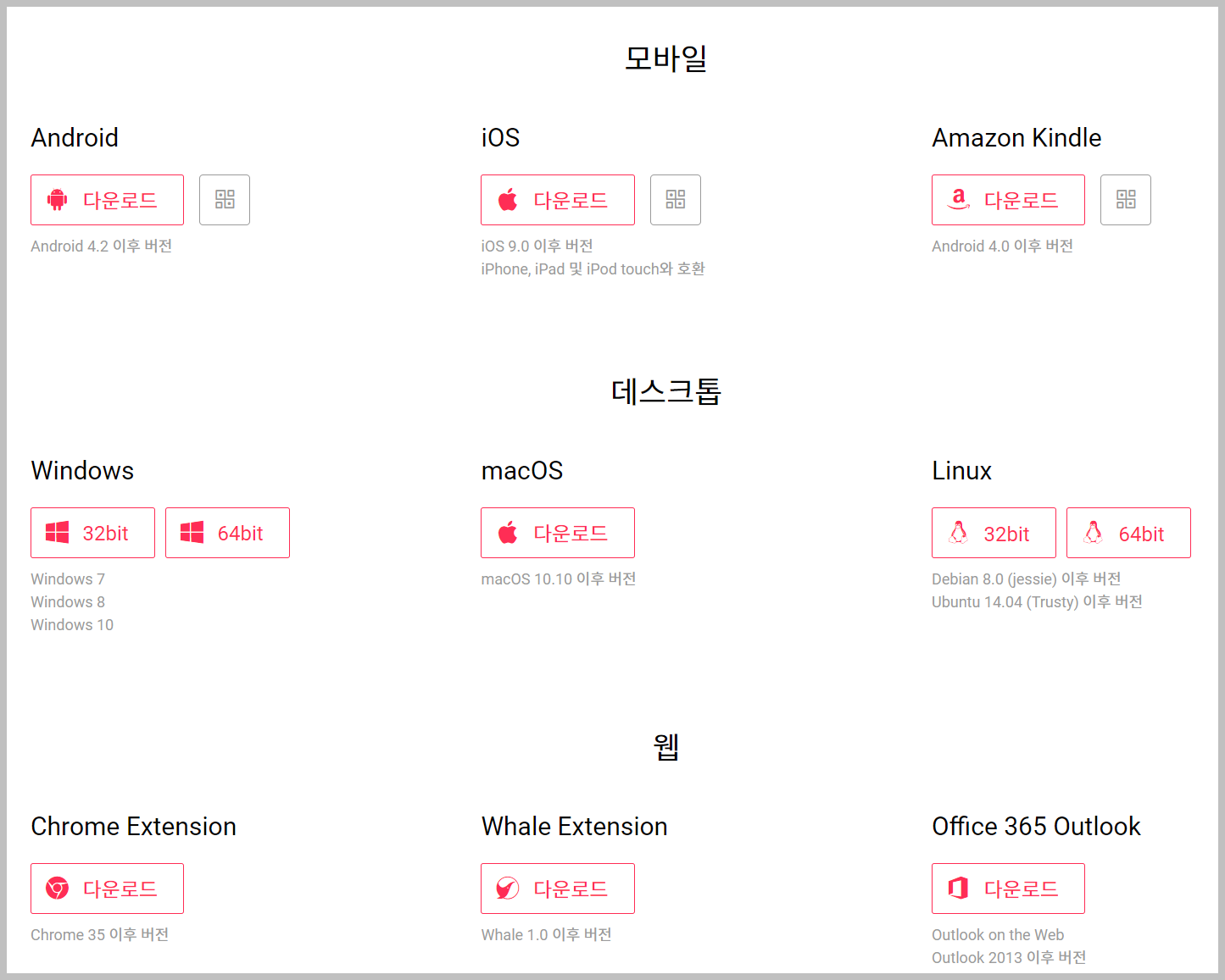 데스크톱( WIn, MAC, Linux )에서 이용이 가능할 뿐만아니라 모바일( Android, 아이폰, 킨들)에서도 이용이 가능합니다. 만약 이 6가지 기기에서 이용을 할 수 없다면 크롬 확장프로그램으로도 이용이 가능하고, 웨일 브라우저에서도 이용이 가능합니다. 심지어는 아웃룩 애드온도 있습니다.
