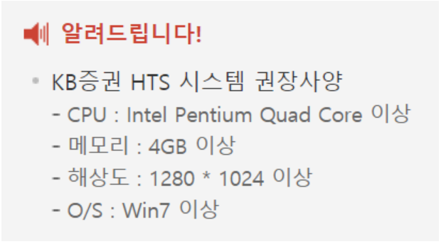 이렇게 많은 장점을 자랑하며, 시스템 권장사항은 위와 같습니다. 최근에 충분히 업데이트된 컴퓨터라면 문제 없이 동작할 것으로 기대됩니다. 따라서 신경 쓰지 않아도 되는 수준의 HTS 권장 사양을 제공하고 있습니다.